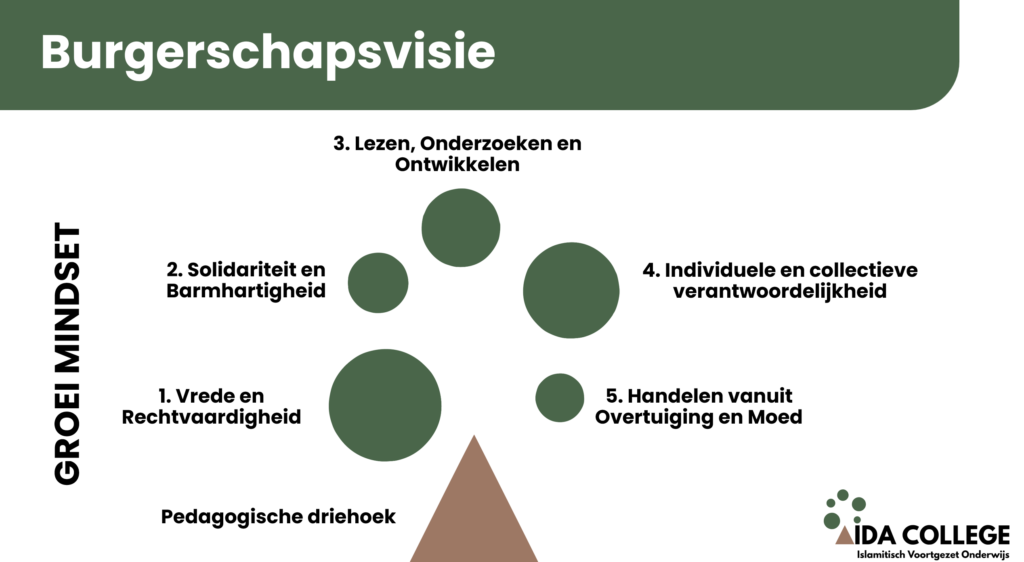 We are by nature and nurture. Elk kind heeft een eigen ontwikkelperspectief. Kinderen ontwikkelen zich vanuit een thuisomgeving. De school is erg belangrijk in de ontwikkeling van het burgerschap. Het onderwijs is de plek waar nadenken en meepraten over het algemeen belang kan plaatsvinden. Het onderwijs biedt bij uitstek de mogelijkheid om burgers uit te rusten met democratische inzichten en competenties. Het is aan de school om in te vullen wat daarvoor nodig is aan kennis, vaardigheden, houding en gedrag. Leerlingen leren dat hun stem gehoord wordt en dat hun inbreng ertoe doet bij besluitvormingsprocessen in de klas en op school. Zij ervaren dat een ander ook een stem heeft en ontdekken daarbij overeenkomsten en verschillen tussen mensen. Leerlingen ontdekken hun primaire en secundaire emoties, ambities, talenten en ontwikkelpunten. Ze ontwikkelen zich cognitief en sociaal, en worden zich bewust van de eigen identiteitsontwikkeling en die van anderen, en hoe op een min of meer vreedzame manier om te gaan met verschillen van inzichten en belangen.